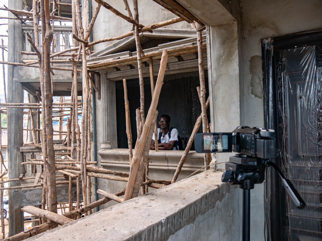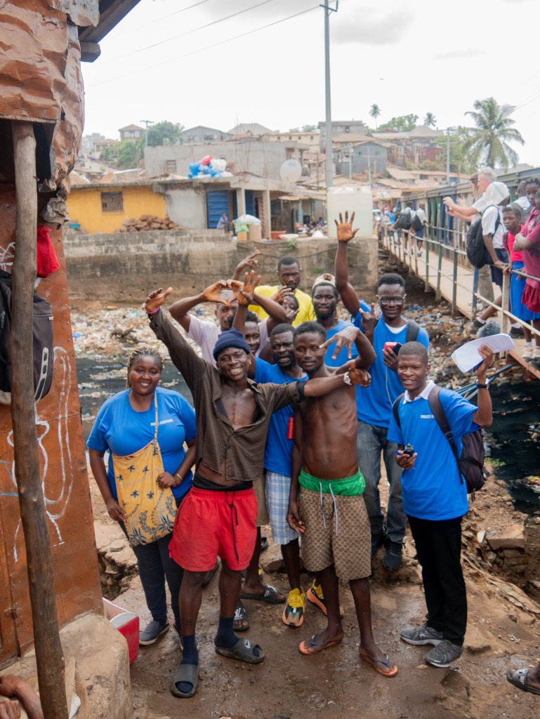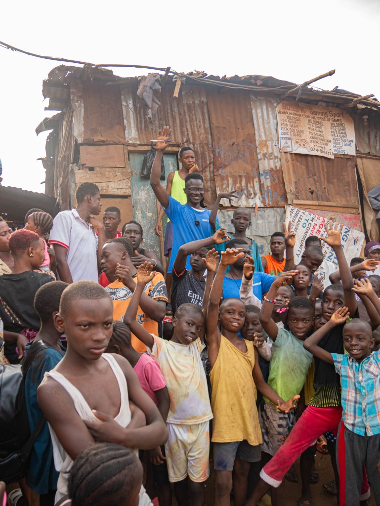 Terug naar het getto. Waar nog altijd de klanken van zingende gangsters (mensen, artiesten) de vuilnisbelt over galmen. Afrobeats. Met mijn driepoot maak ik vanaf een afstandje wat beelden. De kleine camera en het geluid hebben we aan het team uit handen gegeven. Met het idee de samenwerking met het lokale team een stapje verder te tillen, en omdat ik zelf bijna niet tussen de zingende menigte kom. Dat wordt een groot succes. De beelden die we later terugzien hadden we zelf nooit zo puur en ongefilterd kunnen maken. Het is volgens mij heel letterlijk wat Koert Lindijer omschreef toen hij het had over ‘door Afrikaanse ogen.’