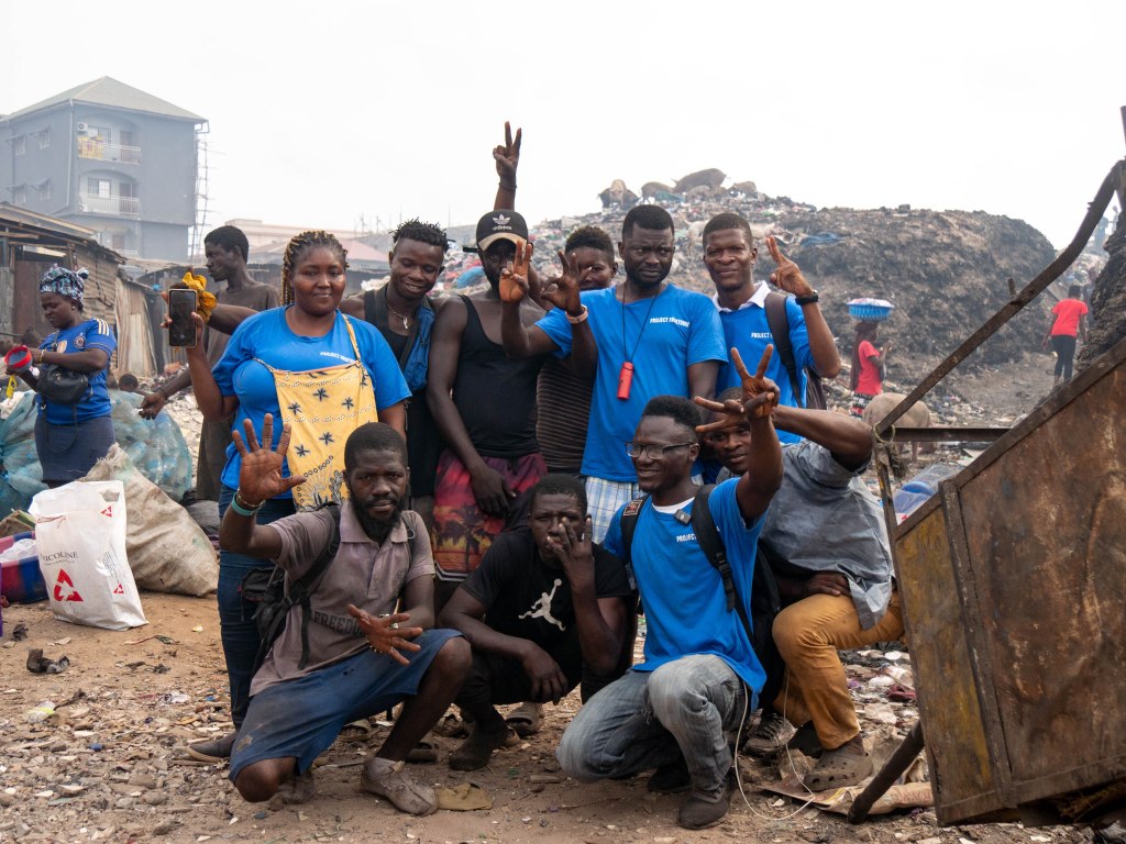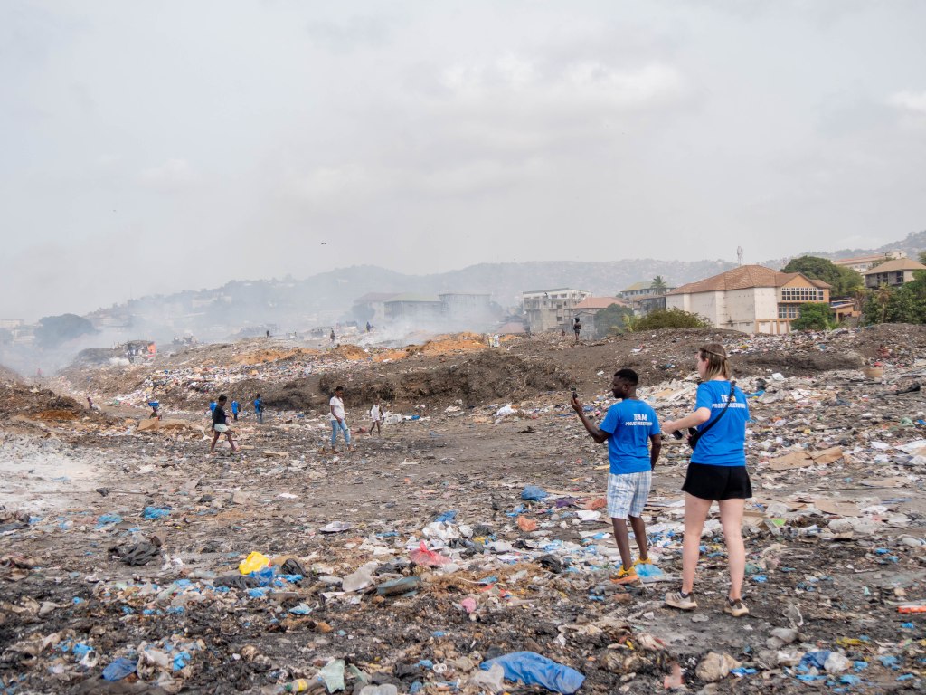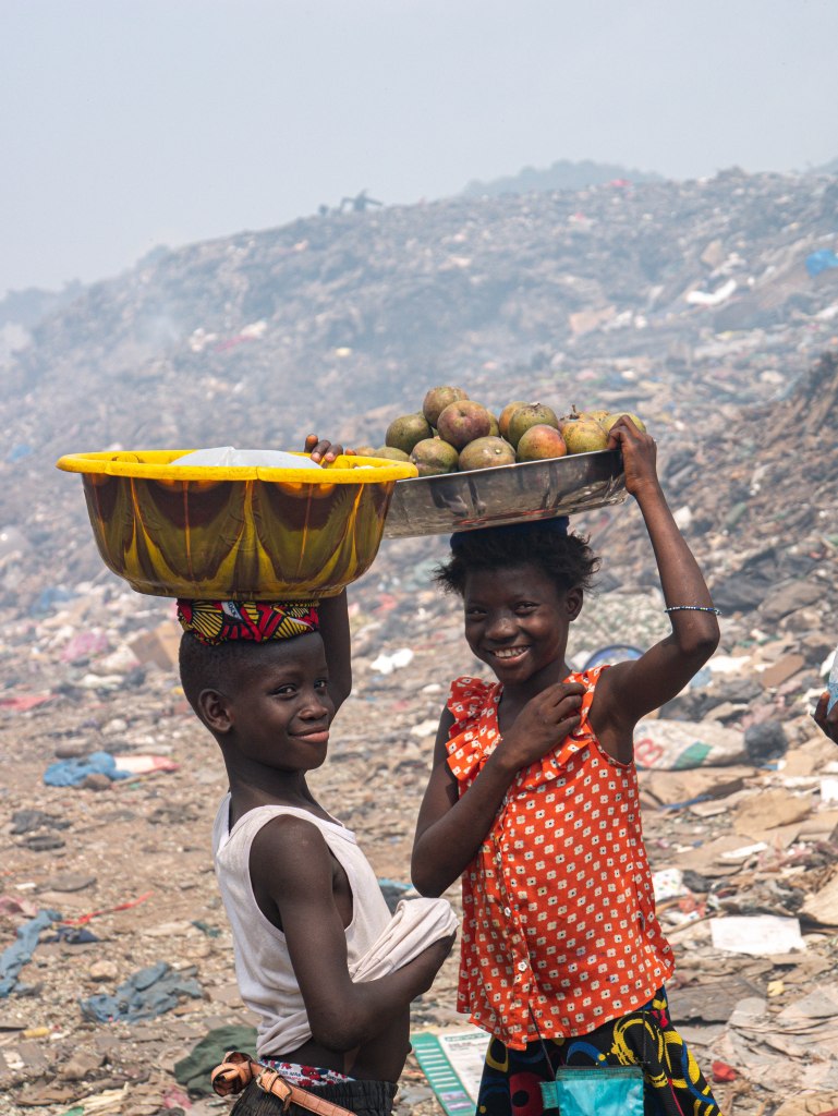 Nu sta ik op een vuilnisbelt. Overal branden kleine vuurtjes en door de dampende massa onder mijn voeten is de strakblauwe lucht grijs van de rook. Twee kinderen met grote bakken op hun hoofd verkopen ons mango’s en nog een zakje water terwijl Milton iedereen bij elkaar roept voor een muzikaal tafereel dat ik onmogelijk in woorden kan beschrijven.