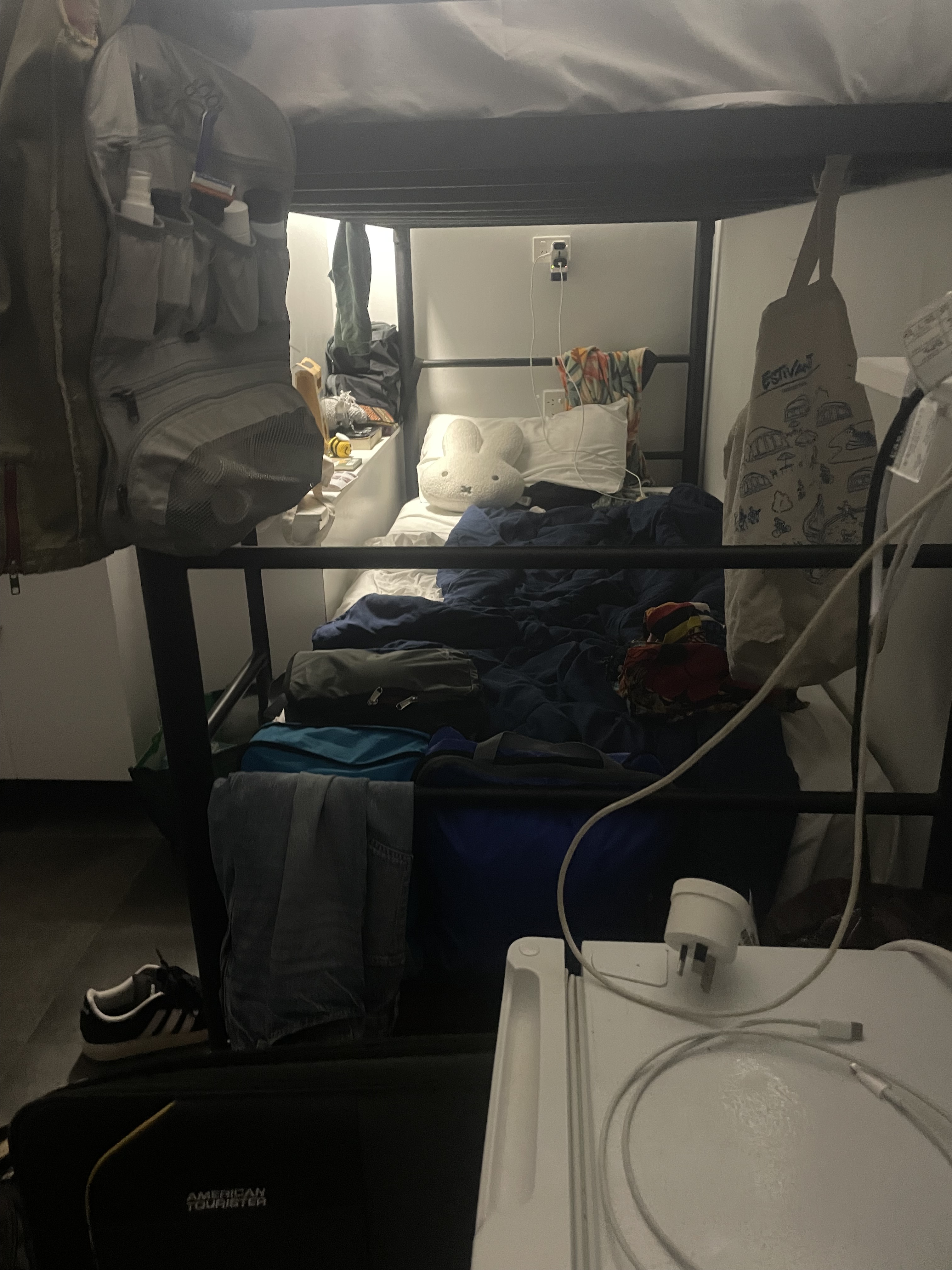Bij het voeteneind van het bed hebben mijn packing cubes een plekje, twee handdoeken hangen als een soort gordijntjes aan de stangen van het stapelbed en ook mijn waszak is vakkundig geïnstalleerd. Stiekem hang ik iedere ochtend een T-shirt over het trappetje, zodat het bed boven mij door nieuwe bewoners als laatste wordt gekozen en er zo min mogelijk woelende backpackers boven me slapen.